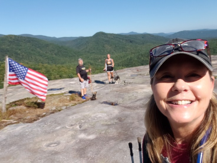 We went to the Lower trail head parking and started up the Wolf Rock Trail. We got to the top of Wolf Rock. It was beautiful. Someone had tied an American Flag to an old tree. We took advantage of getting pictures here. Then up the trail to Cedar Rock.