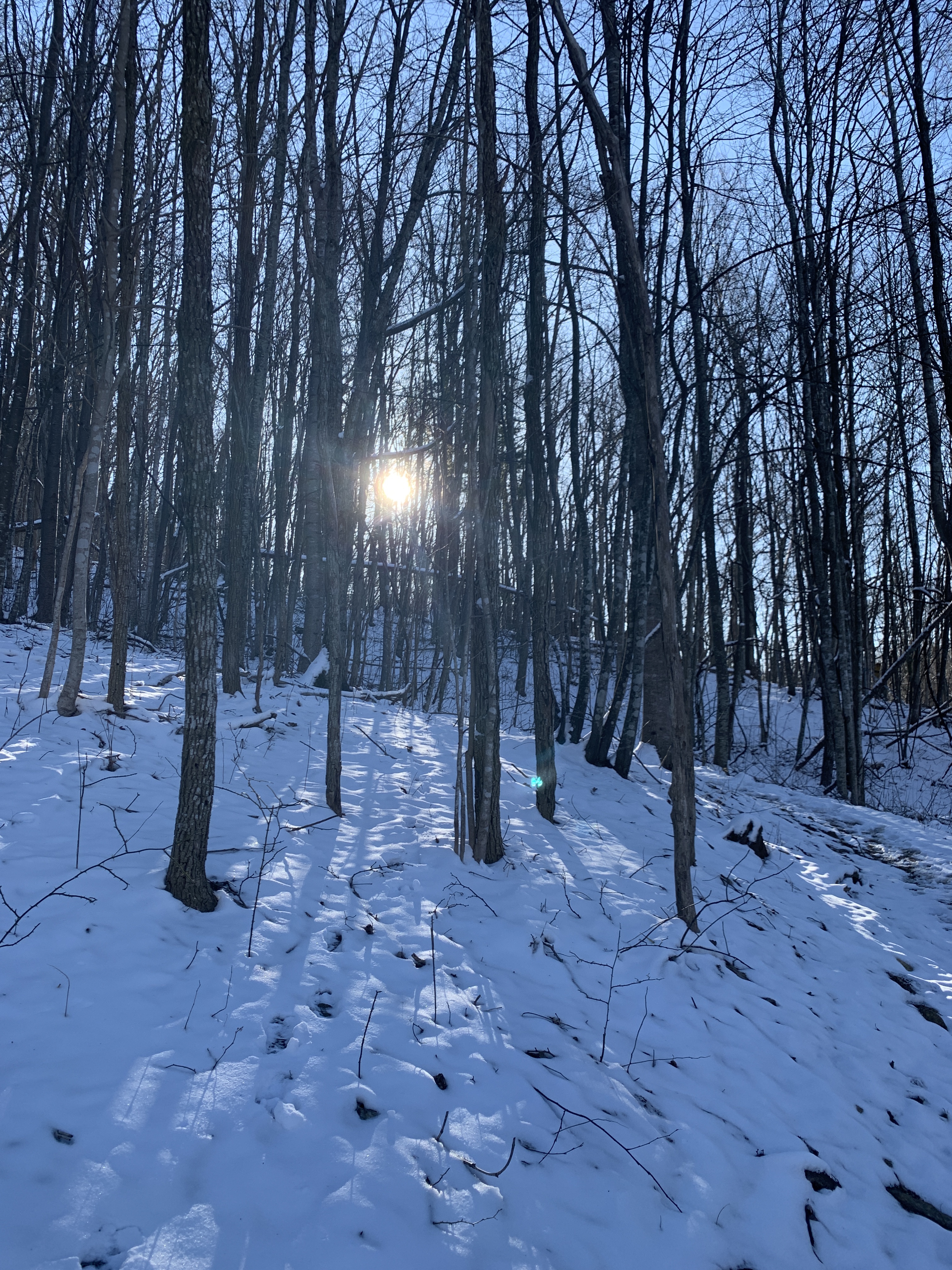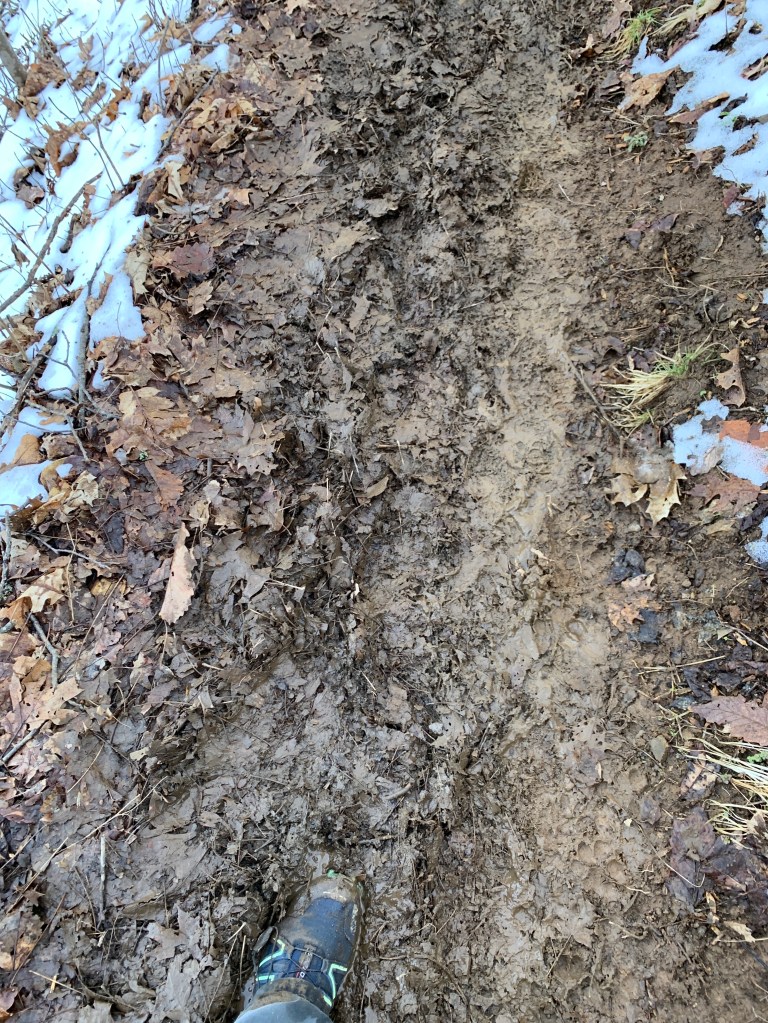 It was a whole new trail coming down. Amazingly most of the snow had melted except behind the trees and in the dark sections. What it left behind was a soaking wet muddy mess of a trail. Really glad I’m wearing those bread bags! We slipped and slid down most of the trail. It’s amazing how much snow was gone. I slid hard one time and grabbed a tree and stopped within inches of a completely wet muddy butt to walk down in. Phew!