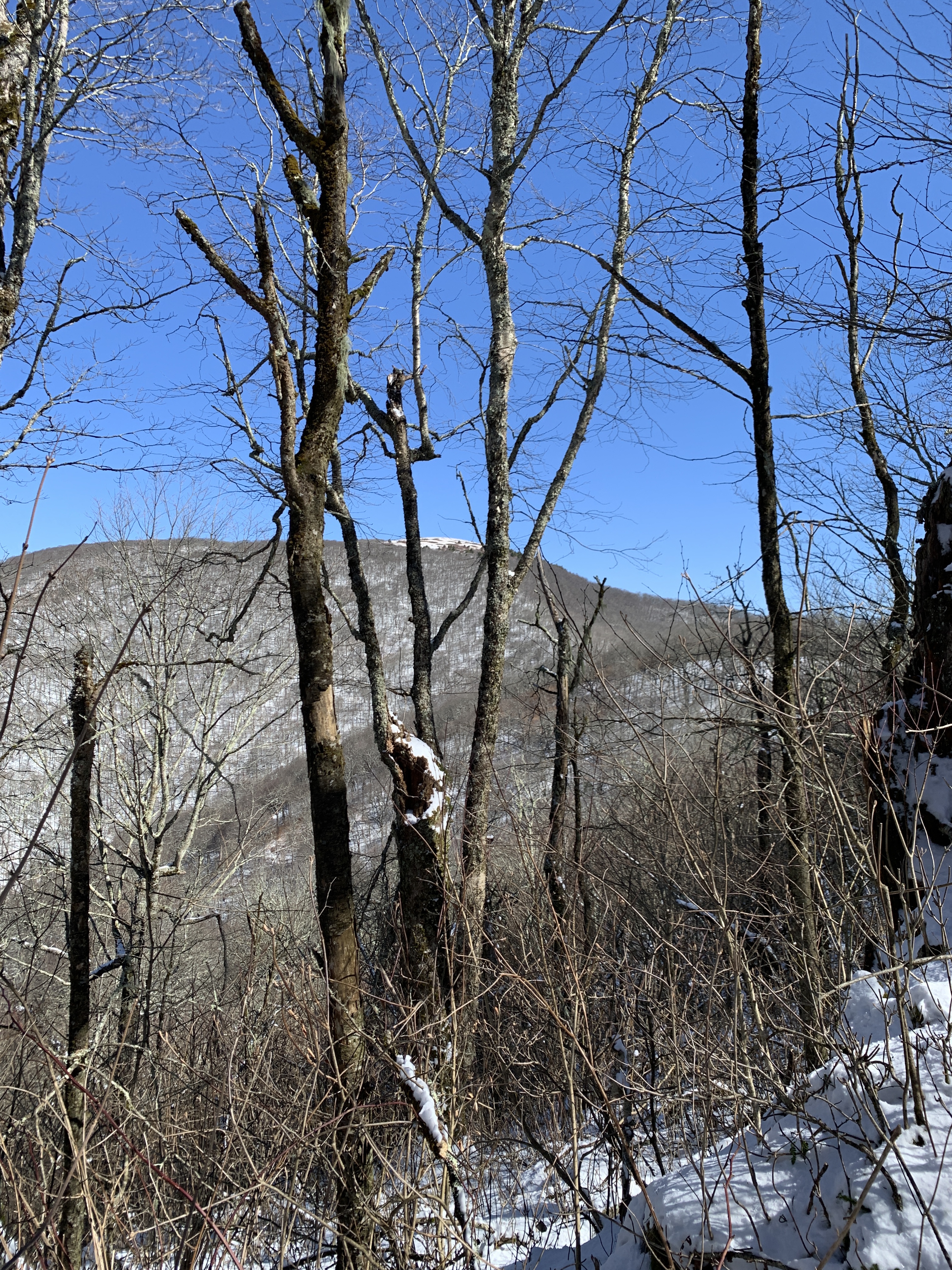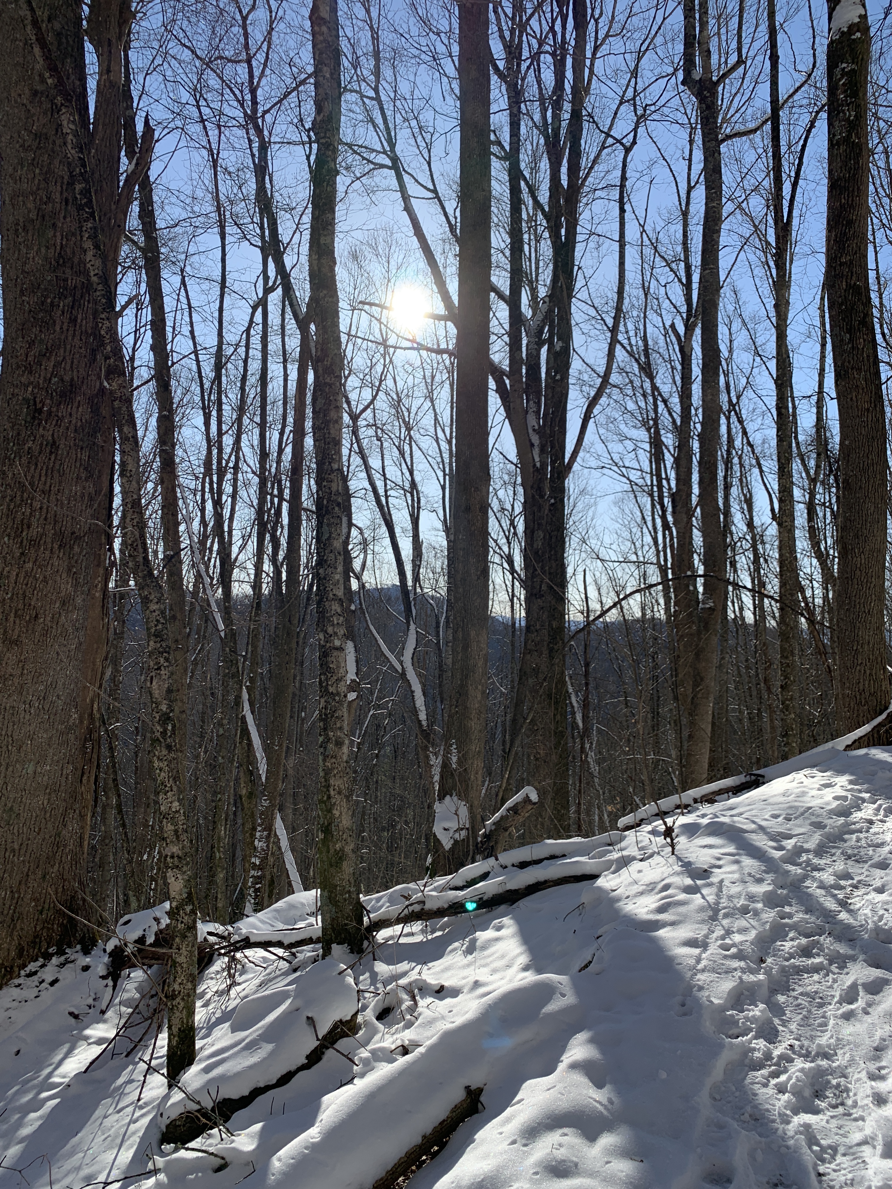 We arrived at Sam’s Gap at 9 am. It was 24 degrees. There were 3 cars in the parking lot. It was 24 degrees. We headed up the trail which goes along I-26 and soon as we made the turn it was covered in snow and lots of it. It was beautiful and cold! Luckily it was all uphill which means we warmed up in no time!