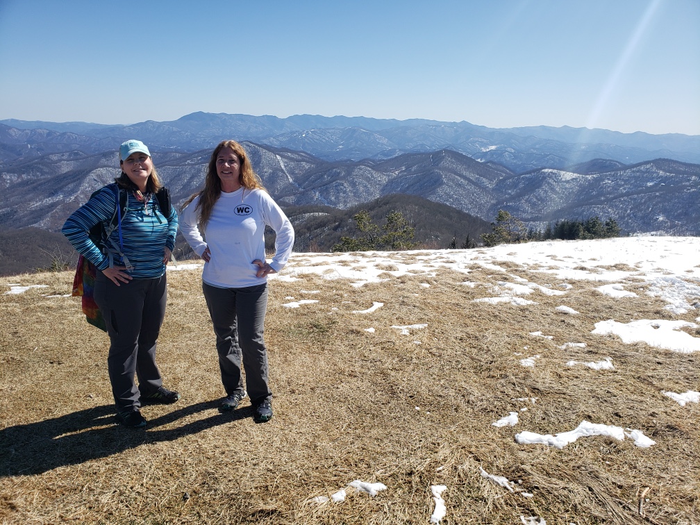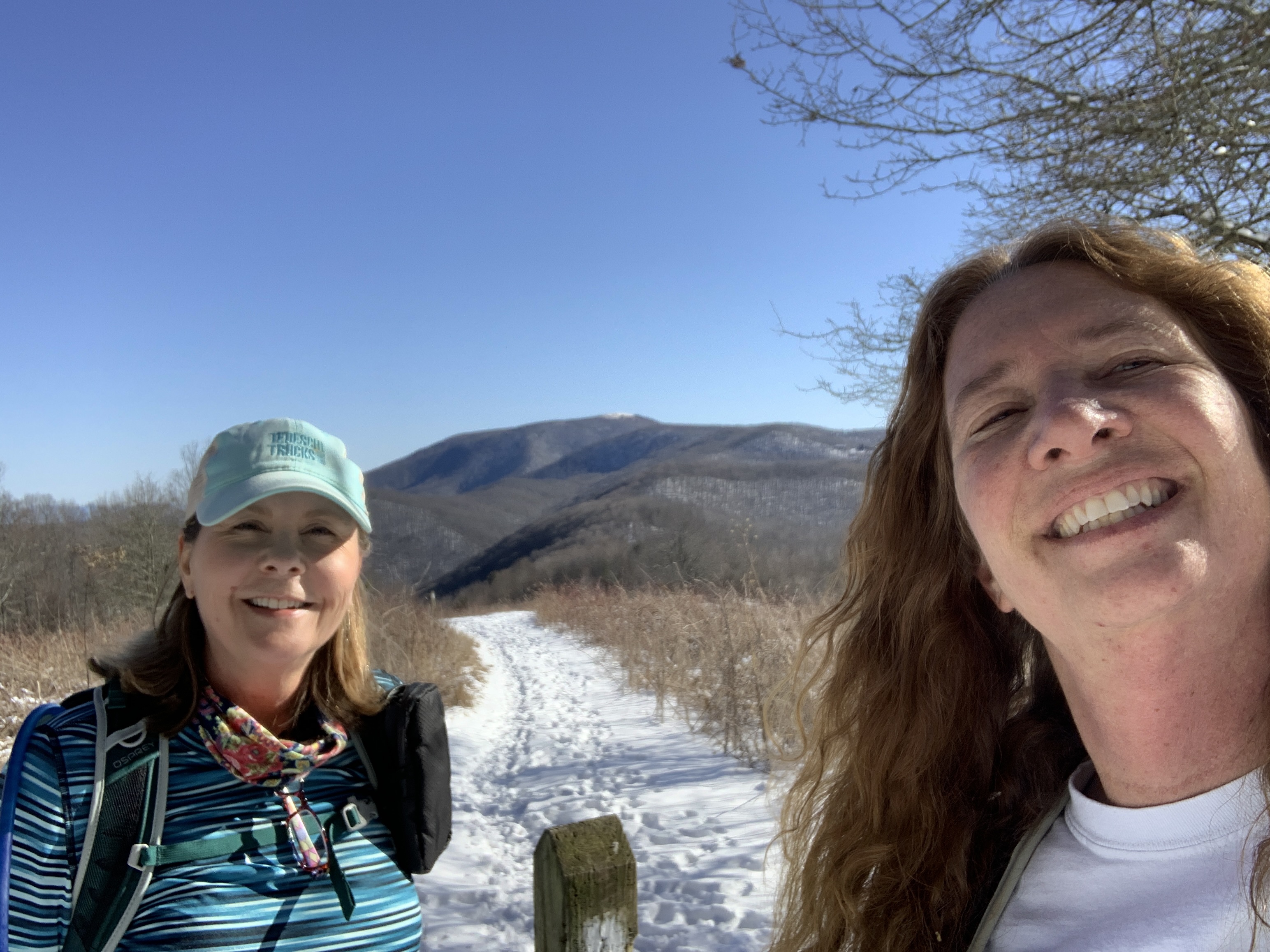 It’s so gorgeous out here. We took a selfie in front of the first view of the bald. It’s a long way up there. Notice we’ve shed the jackets and gloves.