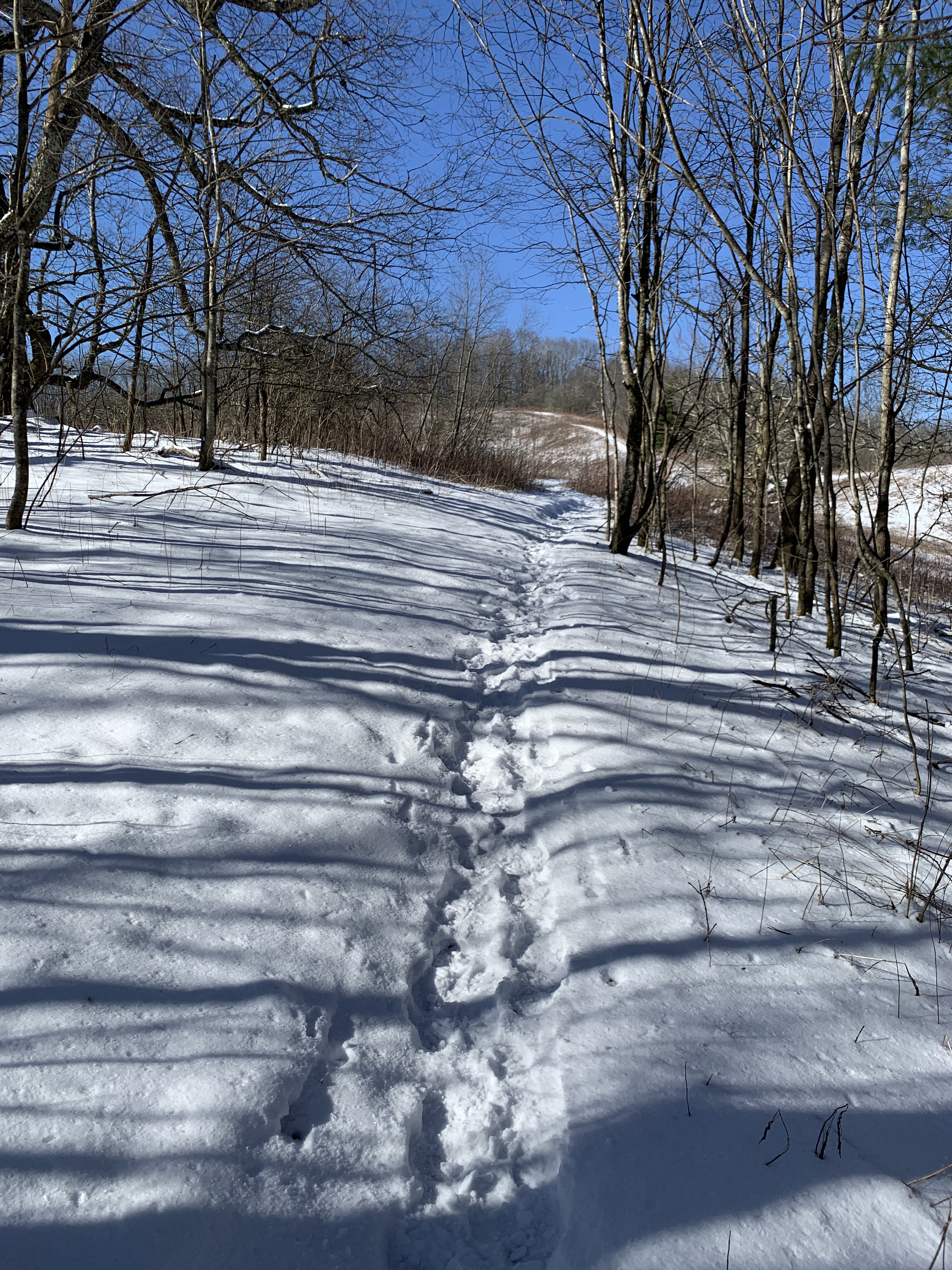 The trail kept going up most of the way. There were only a few footprints to follow but the trail was blazed really well. It was one of those trails that goes around rather than over. That means dark side-cold, light side warmer.