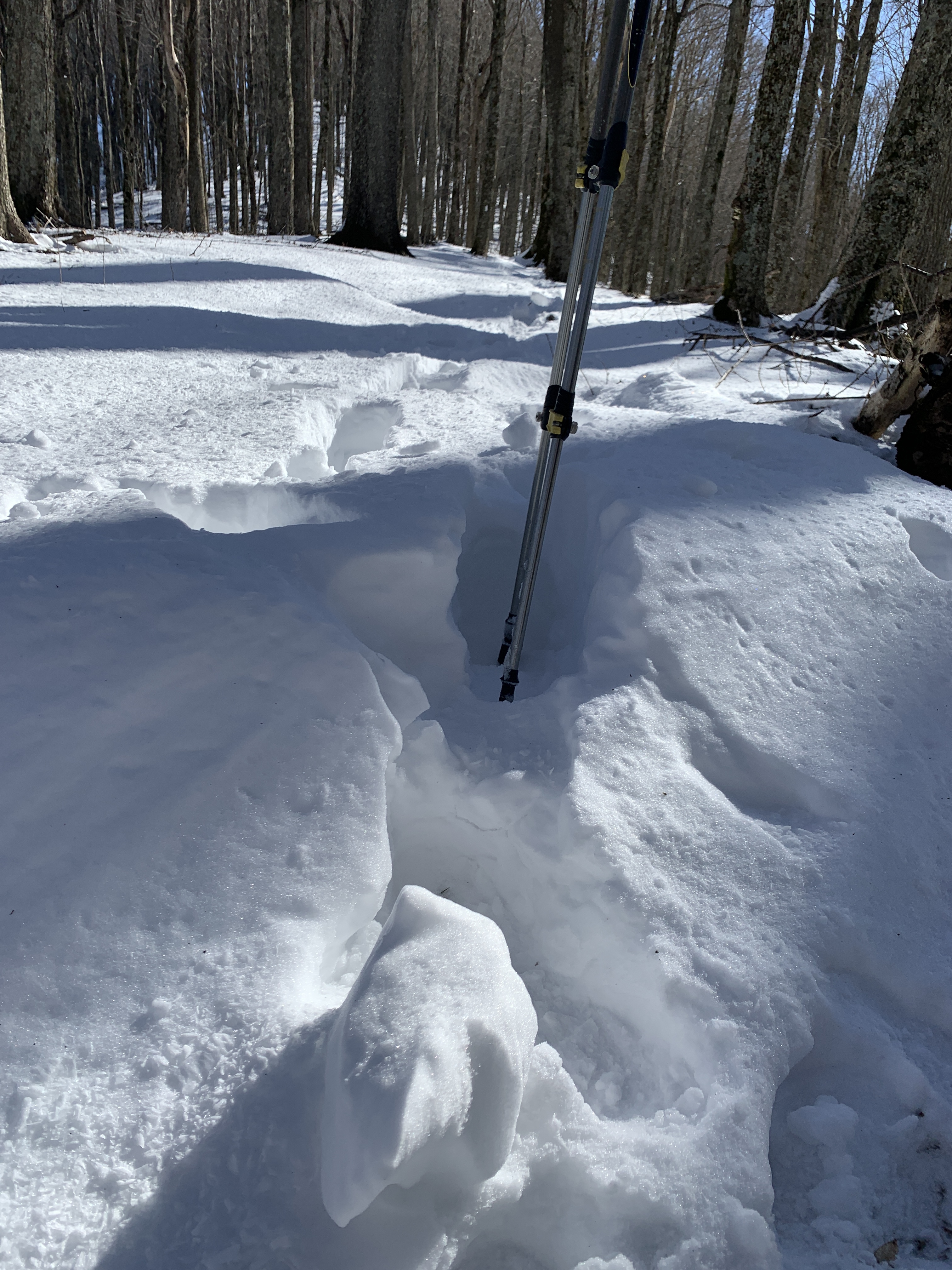 We were loving the snow and the views. The birds were singing and the wood peckers were pecking. The farther we went the deeper the snow was. We were beginning to wonder how deep it would be up higher. The one set of footprints appeared to be a runner. The footprints were farther apart. We walked as best we could in the deep footsteps. Sherri called it post hole-ing. 🤣 This was the deepest snow we encountered thankfully.