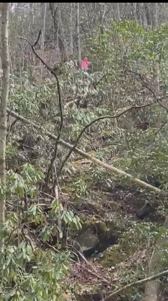 We start walking down an old closed road and we can hear a waterfall below us but we are going to the next one first. The directions are : once you go around the ridge drop off the road and bushwhack down toward the sound. We cannot see this falls and can barely hear it. We look for the least steep way down, which is non existent anyway and do just that. Its briar city but I have my gloves at least. I’m wearing Capri pants and my lower leg is getting eating alive by briars! I’m not sure how far down we go. Then there it is. I’m good with my view which is about a hundred yards shy of the bottom but ol Lisa gotta touch it! I stay up cause that’s just another 100 yards up I have to go. I can barely see her through the Rhododendron and I’m hoping she don’t fall in cause I don’t want to go down there 🤣🤣