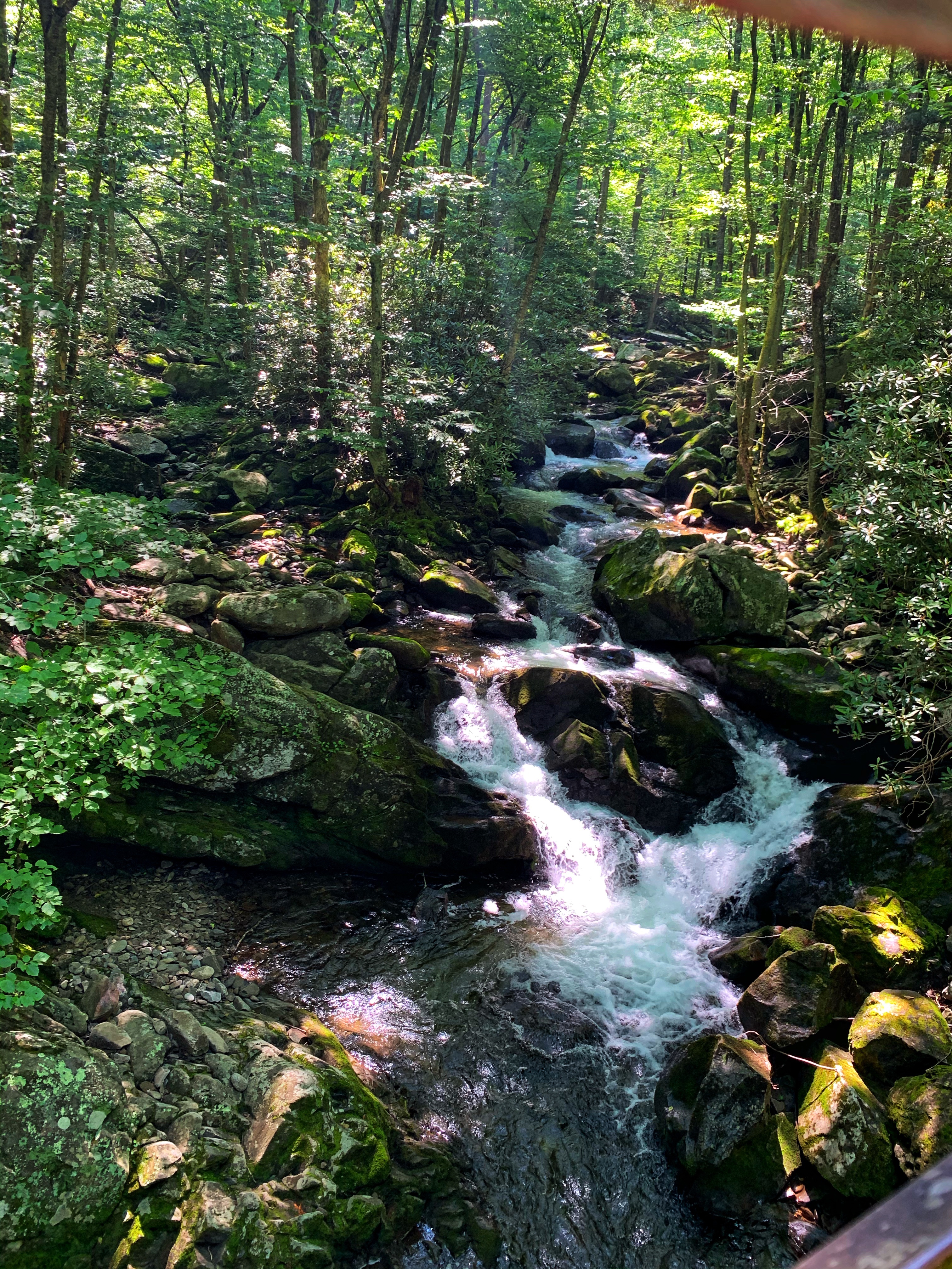 Trail goes over a bridge over Lynn Camp Prong. It’s an old railroad bed trail so it’s pretty wide and well maintained. The trail basically follows the river upstream.