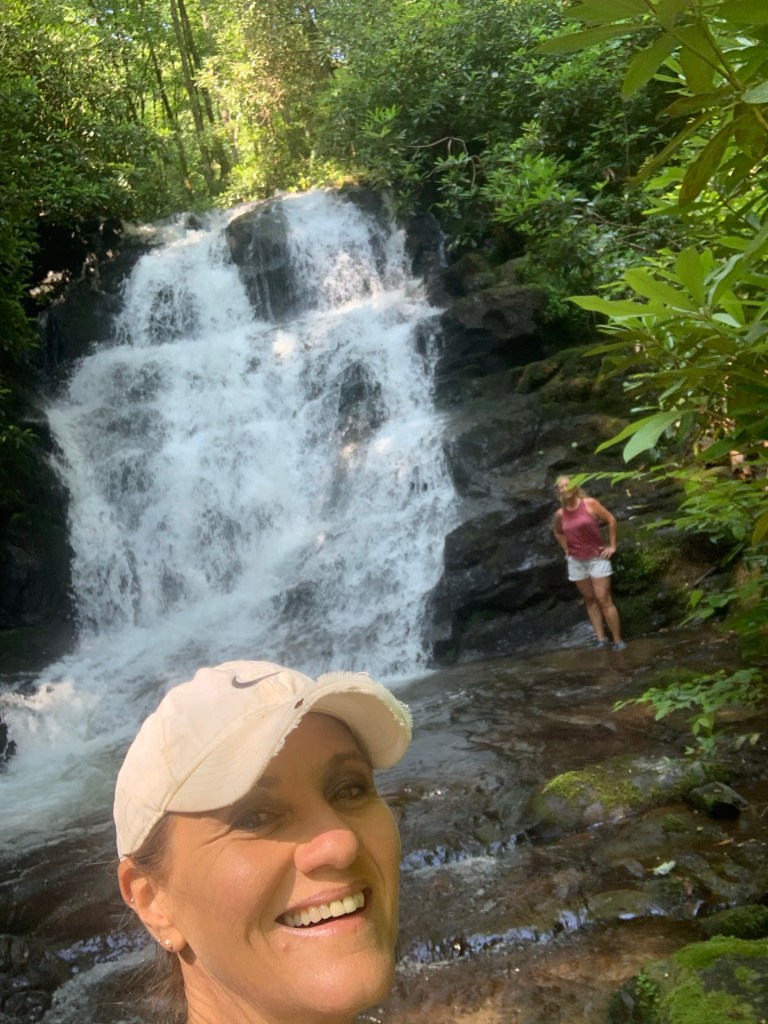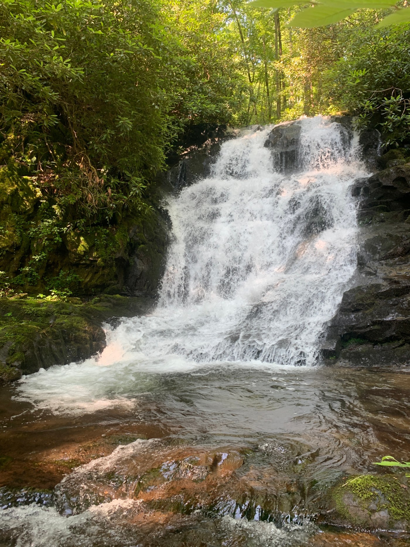Now we decide to climb out towards the trail rather than creek walk down. We go up and to the right until we get to the trail. This part usually kills me but not today! In the pic below is what we came up. The falls is in the back. I just don’t understand why there is a waterfall within a couple hundred yards of a trail and they by pass it altogether?! Wouldn’t it be nice to make a spur trail to it? This one isn’t dangerous. This is the 2nd one in GSMNP like this. I just wonder.