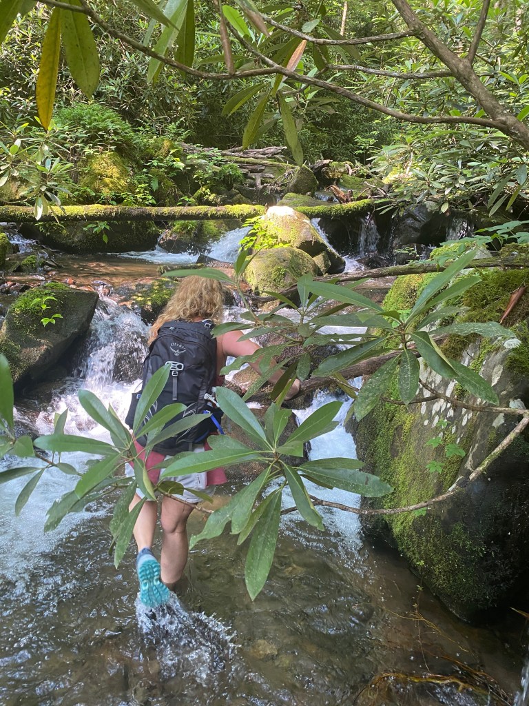 The campsite by the river was cool there were 3 campers there. There is a bridge over the river. We keep going down our trail. At the next intersection we go left and cross the water. This is now Bear creek trail. We continue up it and then look at the track. Now the track we are looking at makes a loop here. We decide it was shorter to go back a bit and take the left side of the creek. It’s a bush wack either way. It all starts out fine as we follow the creek up stream then it becomes a rhododendron fight! With my Curley hair the rhodo’s always win so I say “let’s get in the creek!!!!” We start climbing up the creek now. It’s much better! That part was fun!