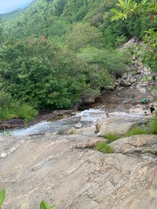 We took a group photo here. Then crossed to the left and took a sort of tunnel through the rhodo’s. It was pretty cool. It came out above the falls and we jumped back in the river and creek walked. Everyone had hiking poles except me. The creek walk was a little hard without poles because unlike the first half these rocks were slick.
