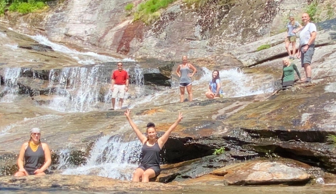We took a group photo here. Then crossed to the left and took a sort of tunnel through the rhodo’s. It was pretty cool. It came out above the falls and we jumped back in the river and creek walked. Everyone had hiking poles except me. The creek walk was a little hard without poles because unlike the first half these rocks were slick.