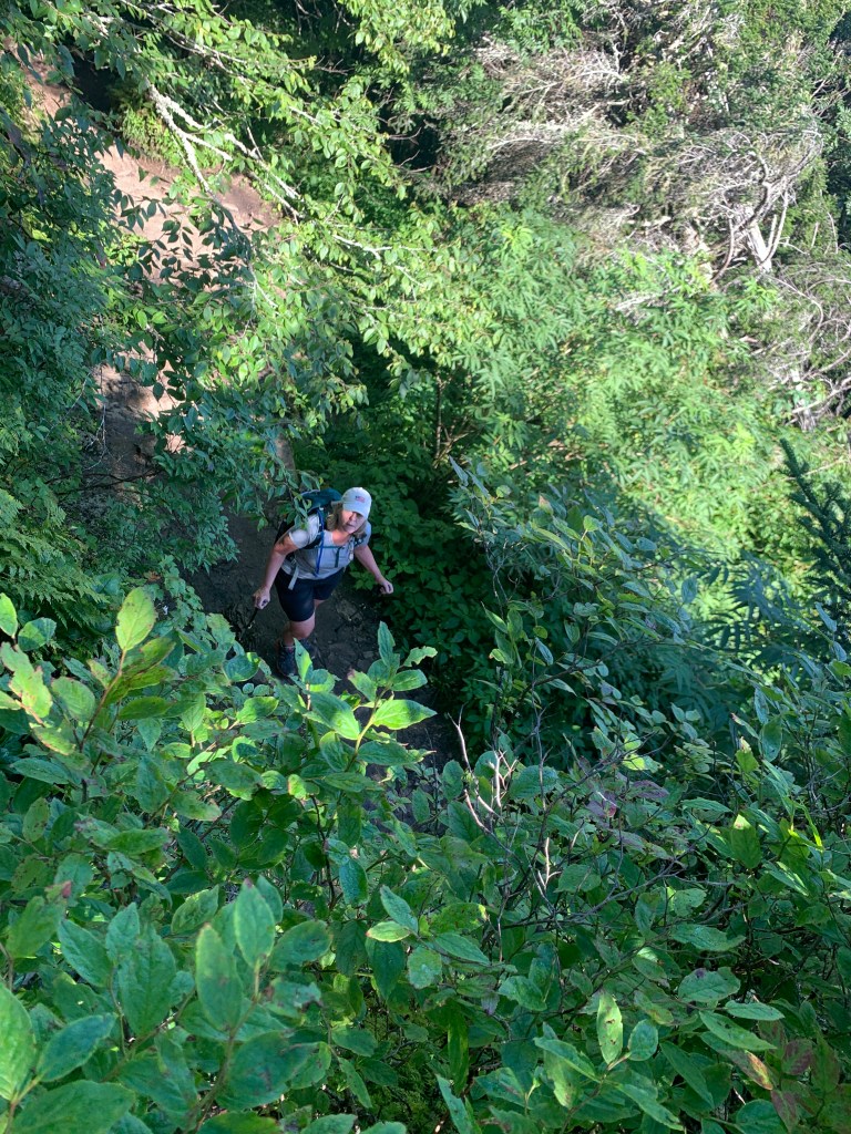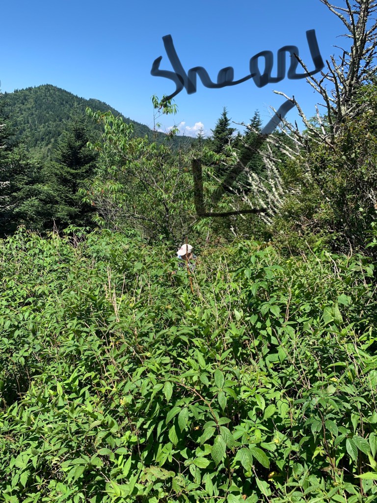 We got back on the trail to make our wsy to the next peak Mt. Lyn Lowery. It’s only about 2 more miles but again it’s a hard hike down and up steep areas with root filled trails. After a while the trail becomes super thin and overgrown. Below is a pic of Sherri’s head barely sticking out. Poor short Daina was covered in the overgrowth! I do have a track that we are following but it was somewhat marked with yellow marks. It’s a bit confusing in places. Two guys passed us and that was it for people all the way.