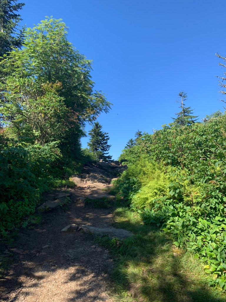The parking lot is kinda busy already. We take the trail up to Waterrock Knob. At first it’s a paved pathway that’s pretty steep. We start out at like 5800 ft elevation and it’s steep. I always blame being winded on the elevation! It goes to an overview. Then it becomes a steep dirt trail up to Waterrock knob. This is me looking down on Sherri coming up the trail.