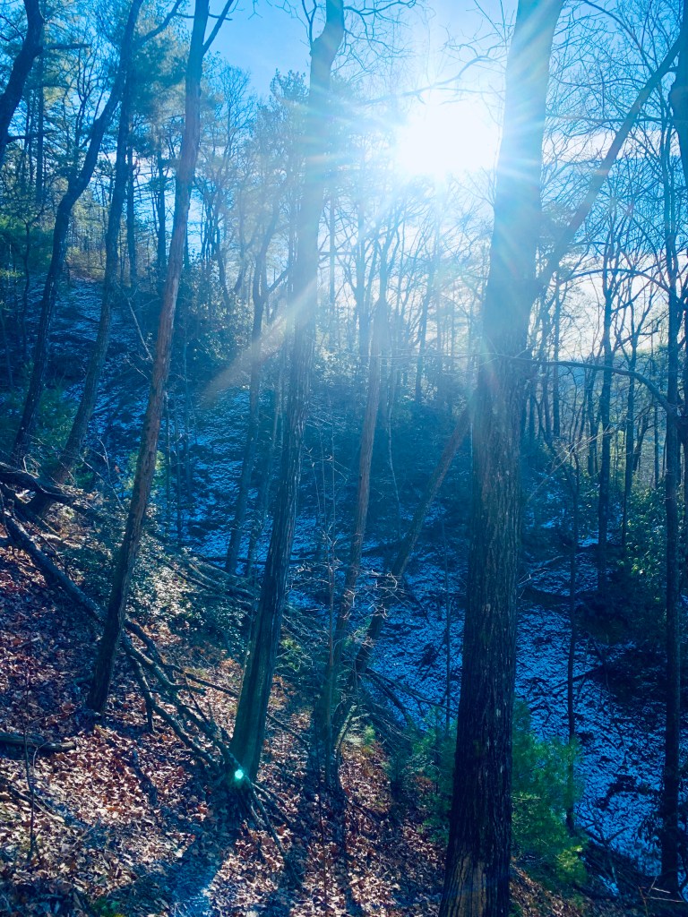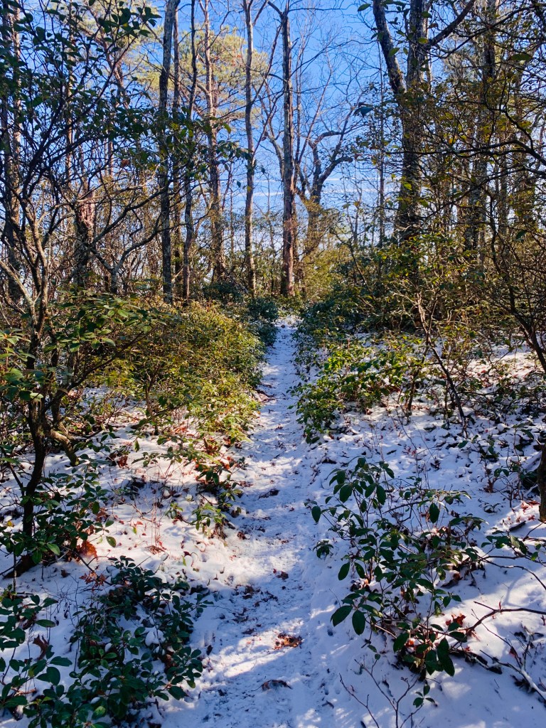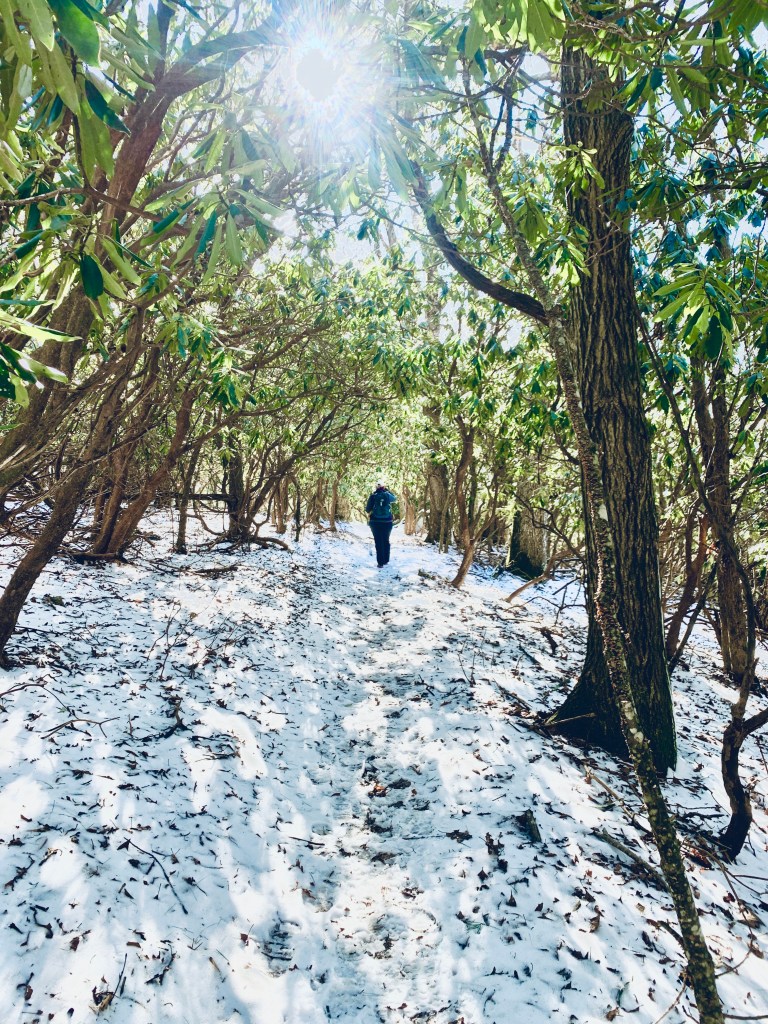 This is definitely a winter hike because it’s almost no views but a very nice trail system. It’s about 32 degrees and 9 am. And there is snow on the ground! This trail is basically all uphill so off comes a layer in less than half a mile. The elevation change in 4.4 miles is nearly 2000 ft!
