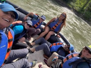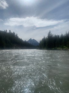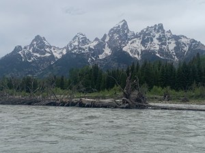 It was so hot. Everyone stayed in their clothes and I changed to shorts. Our van showed up and drove us to the drop in. Our guide wasn’t very friendly and sounded like Dan Ackroyd. He gave us the spiel and then we headed for the river. We all got on. The floor was covered in carpet in case you didn’t want to ride on the raft edge. We headed down river all along the Tetons. Sometimes we were in the front sometimes we were in the back as the raft turned. The current was strong and the water was up. Our guide kept saying how some companies cancelled today because of this.